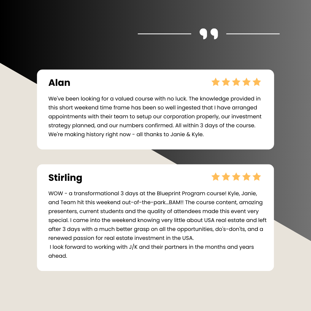 - Priority Access To JK's Deal Butler - Our premium done-for-you concierge deal service, where Kyle personally finds and vets deals, negotiates with the seller, sends in the contractor, inspector, and appraiser, handles all renegotiations if needed, and hands you a ready-to-close opportunity on a silver platter.