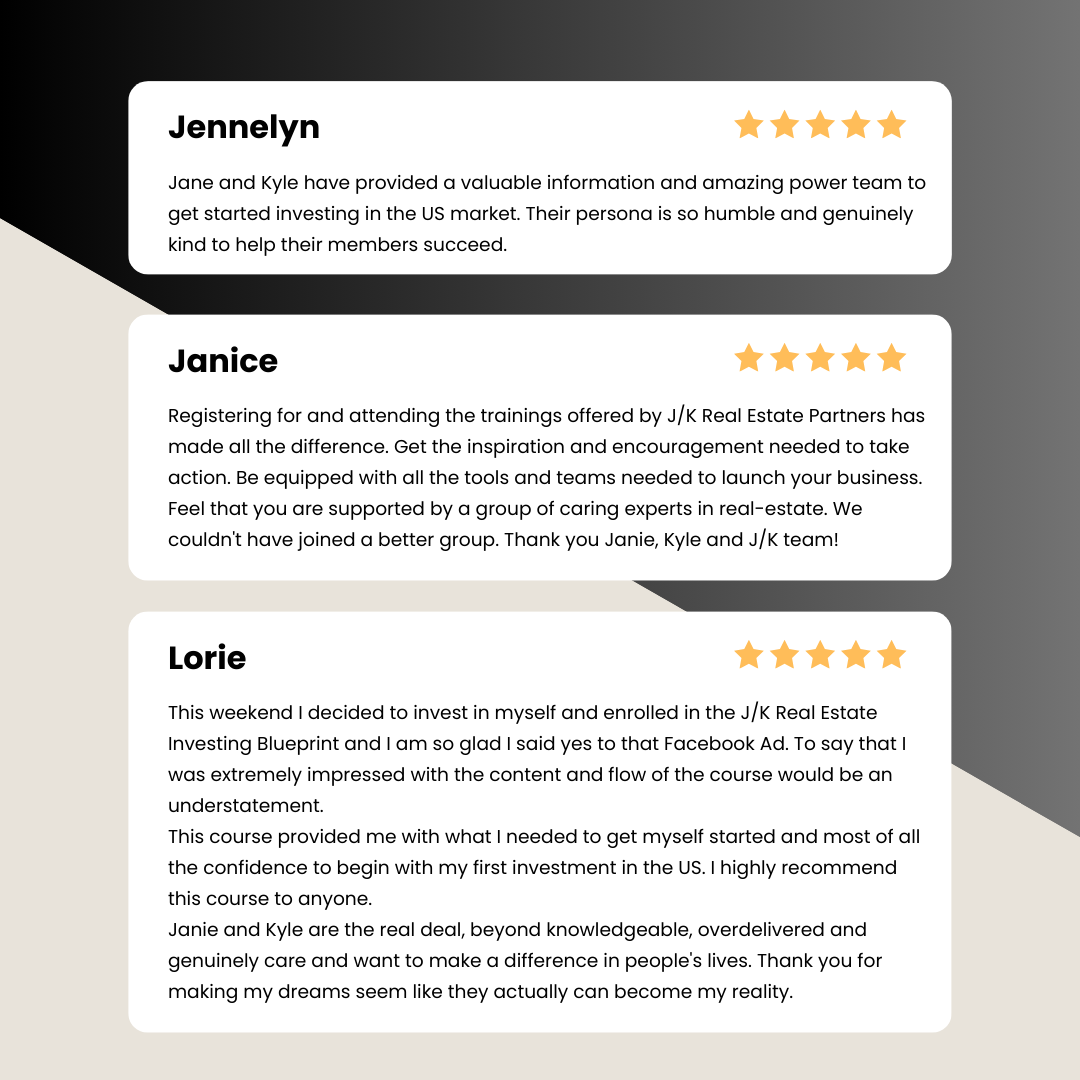 - JK Alliance Mastermind - Every 2nd Tuesday of the month, we meet virtually to deep-dive into deals, remove bottlenecks, and re-align your action with your goals.